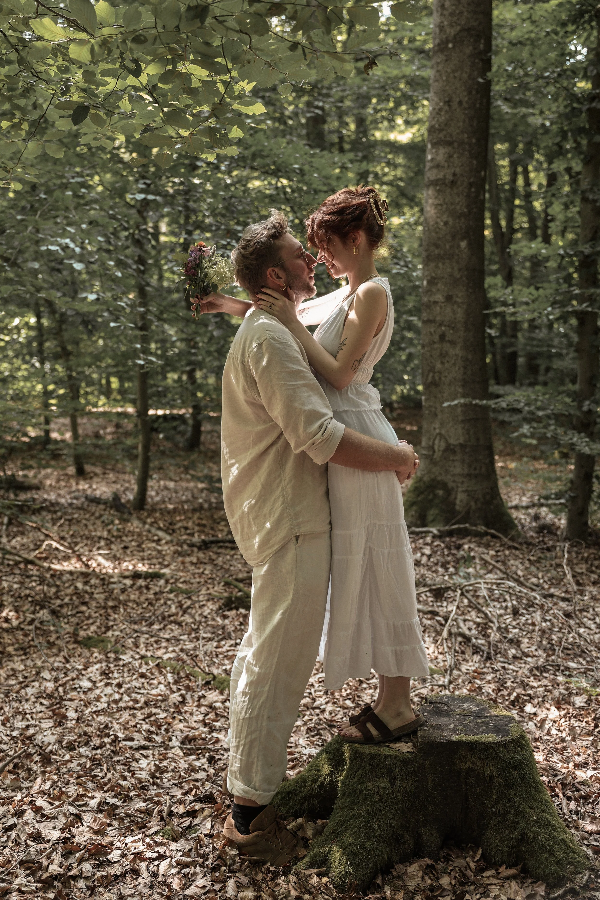 A pre-wedding session set beneath forest trees, away from the summer sun,